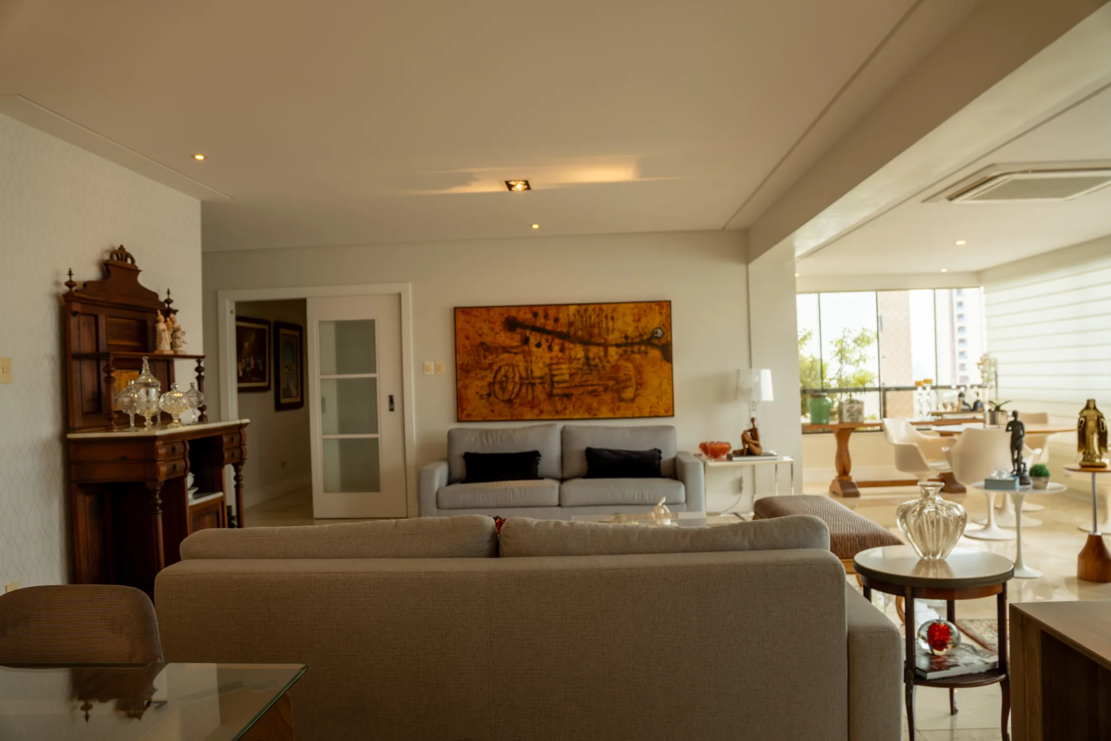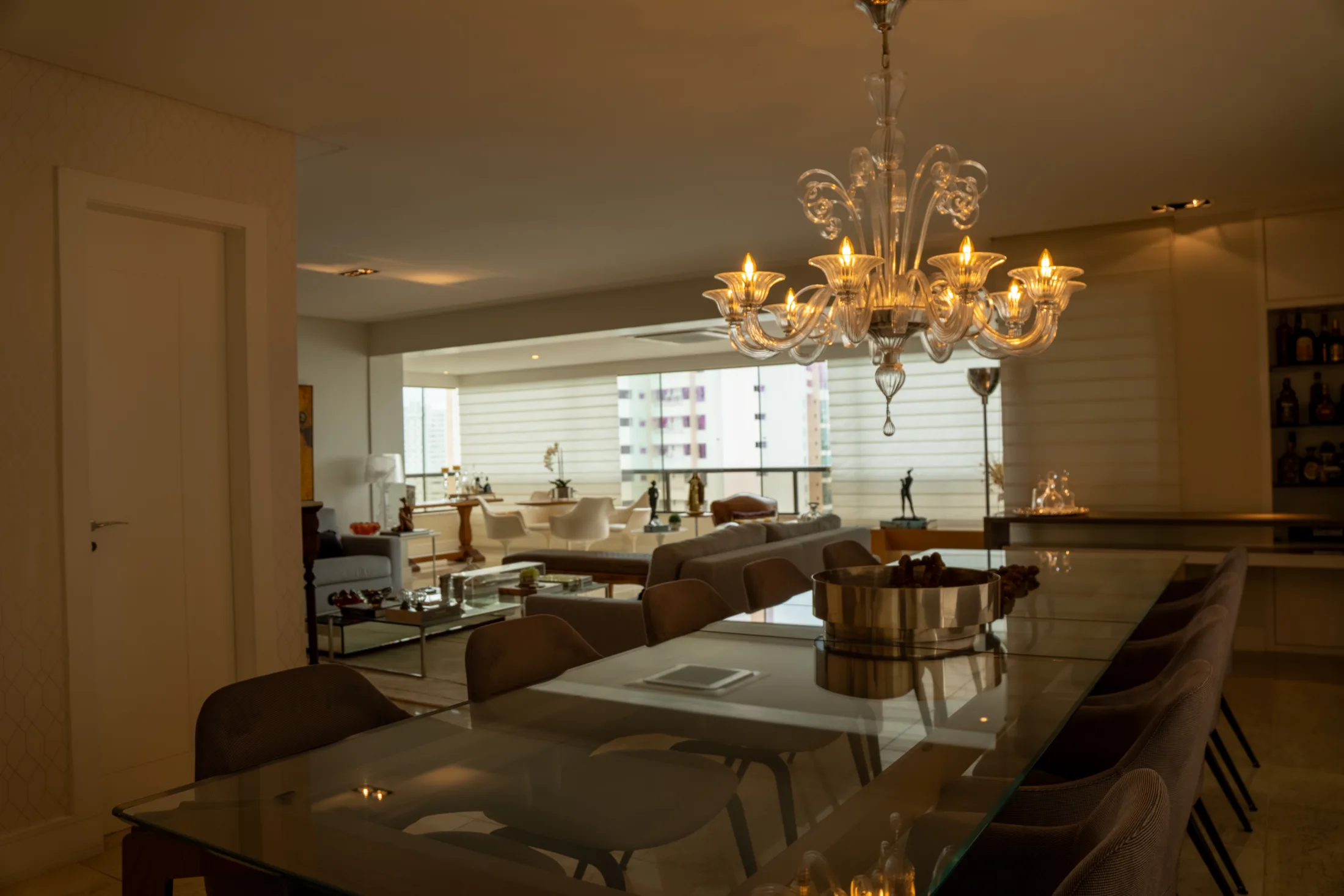 A excelência se manifesta nos detalhes internos: somos imediatamente recebidos por um living amplo que se integra perfeitamente à varanda e à área de jantar, em um design pensado para o máximo conforto, luxuosidade e recepção. O primeiro pavimento conta com 278 m² e comporta três suítes de espaços generosos, além de uma sala dedicada a home office. Estes ambientes são conectados por um corredor que culmina na escada de vidro, direcionando à cobertura.