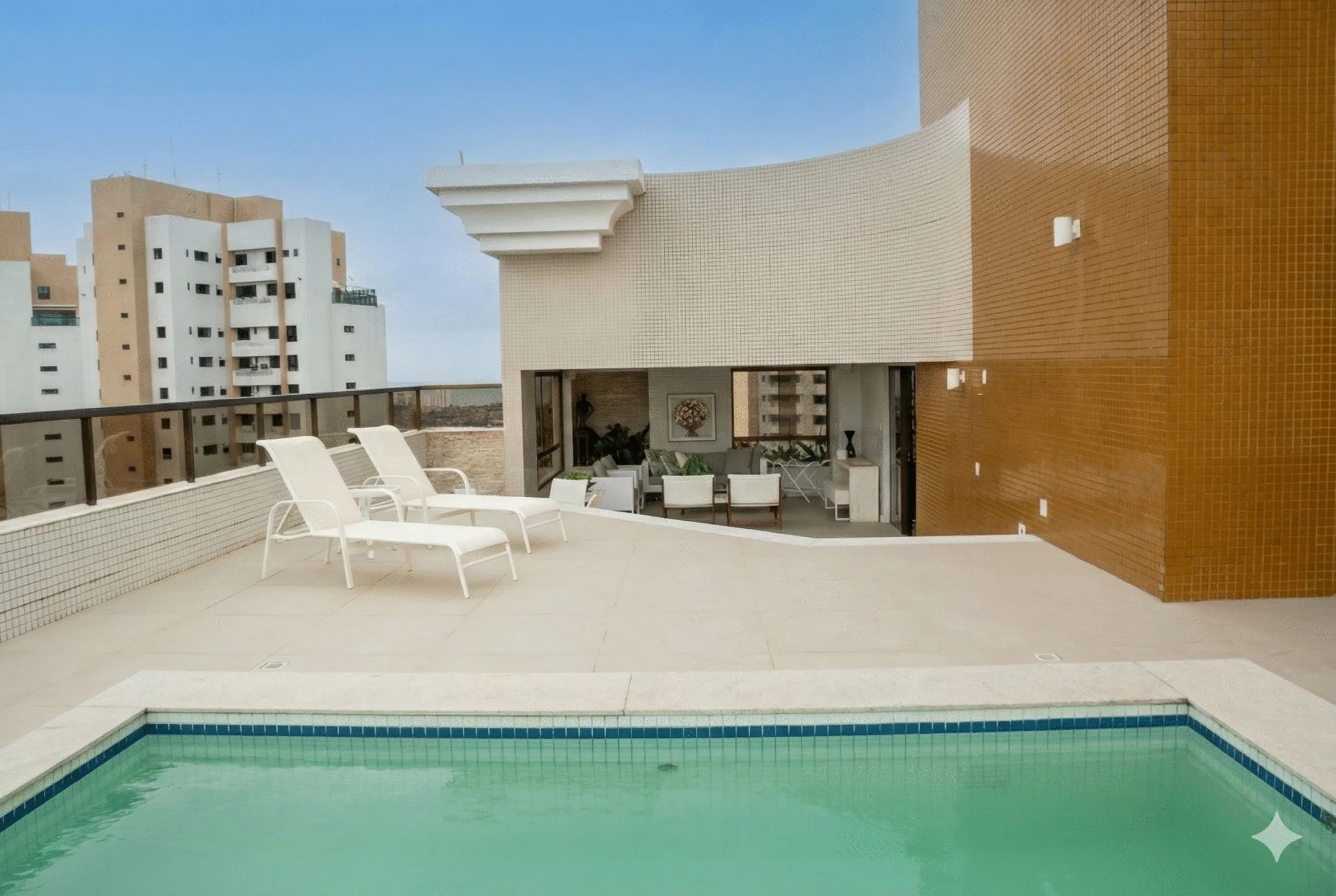 No pavimento superior, a cobertura de 248 m² é um verdadeiro refúgio na capital baiana. Dispõe de uma piscina privativa ampla, cercada por espreguiçadeiras á luz do sol, espaços de convivência e sauna seca. A vista é o grande destaque dessa cobertura: uma perspectiva panorâmica 360 graus que coloca toda Salvador sob o seu olhar. O andar da coberta ainda inclui uma sala de estar íntimo com home theater, varanda com mesa de jantar, uma suíte completa de apoio e cozinha auxiliar.