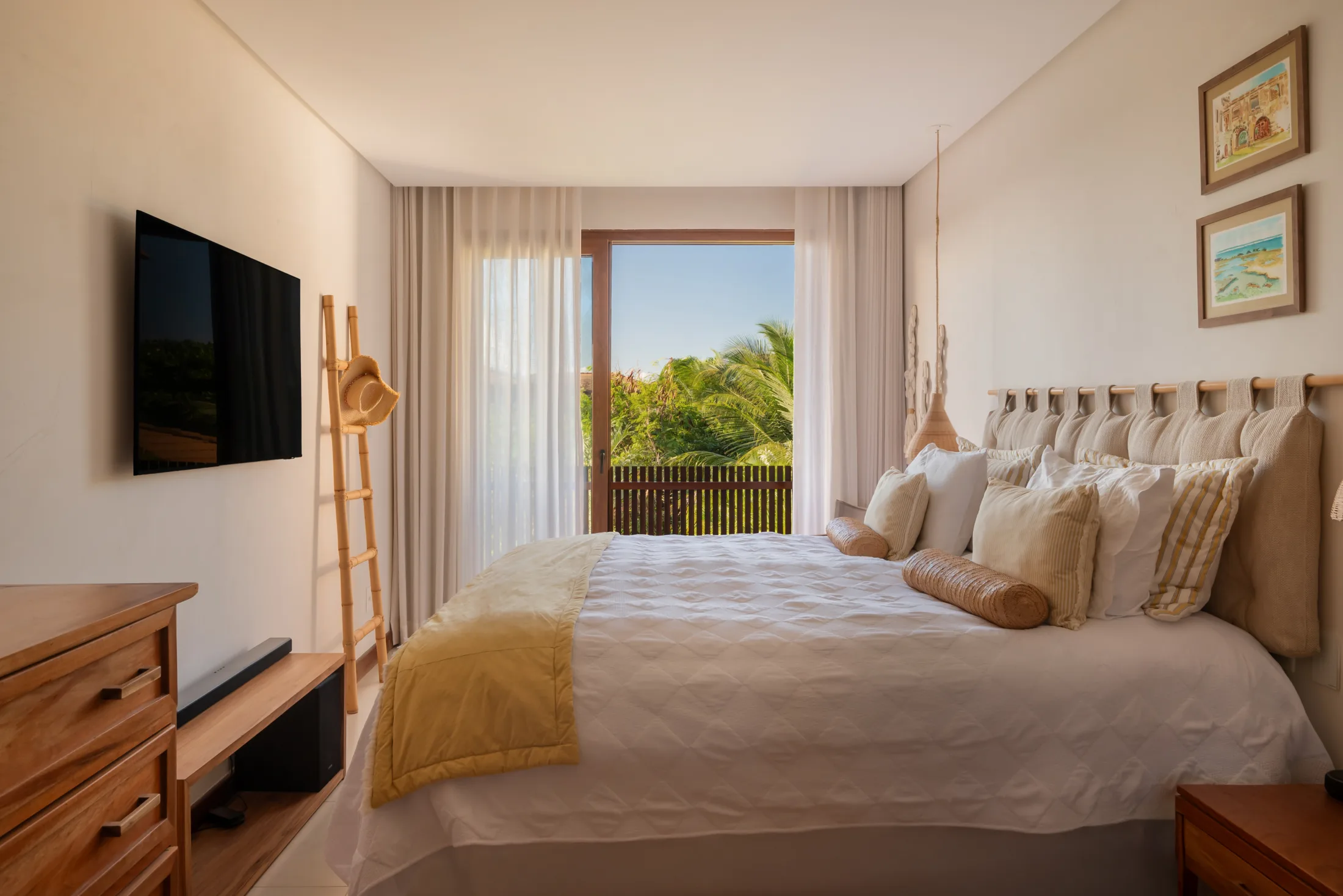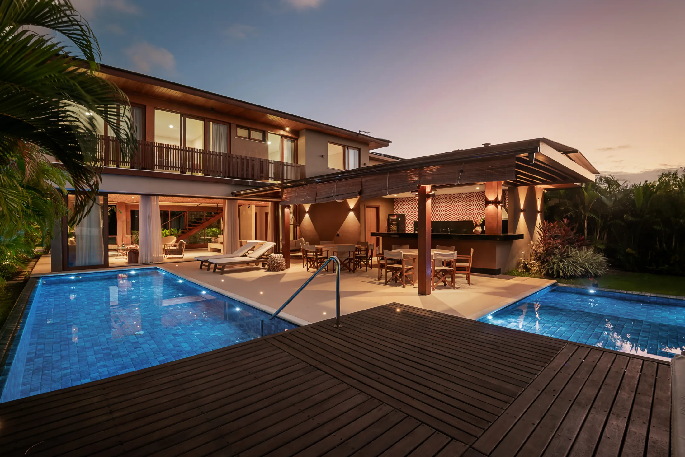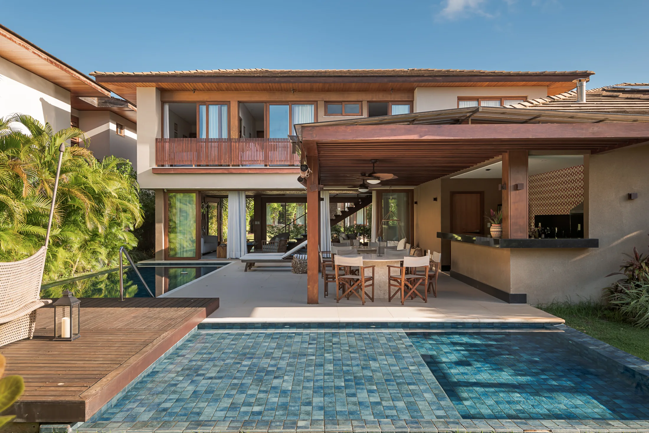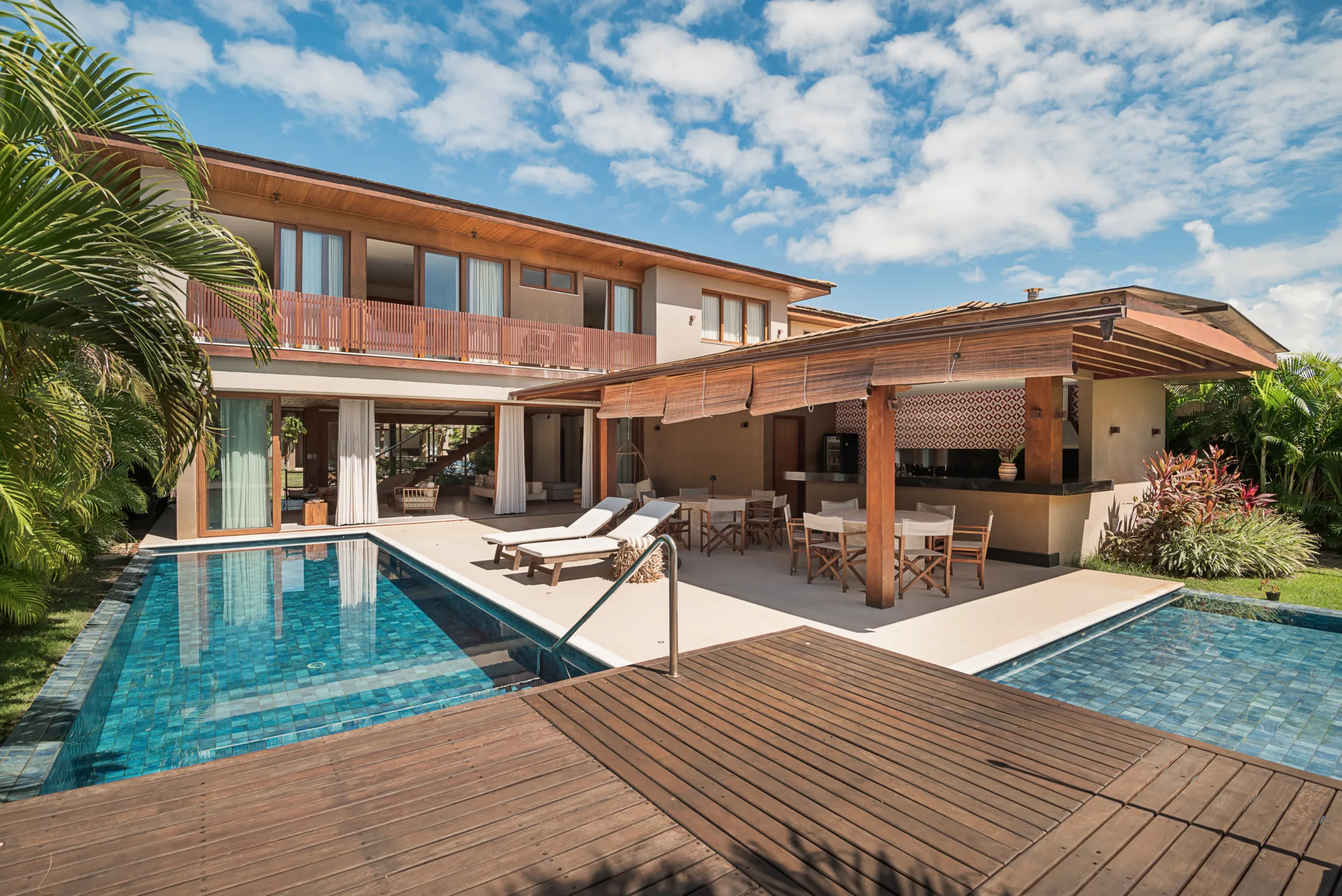 São 05 suítes completas, sendo uma térrea, com decoração tropical e tons claros que garantem ainda mais conforto e proximidade com o estilo de vida do litoral baiano. A presença do forro de palha e de elementos em madeira natural se fazem presentes em todos os ambeintes e a integração dos espaços cria uma atmosfera leve e serena. A casa conta com automação da Alexa e a área do gourmet externo convidativo conta com um balanço, duas mesas que acomandam ate 10 pessoas e a ilha central com banquetas, uma churrasqueira e cervejeira.